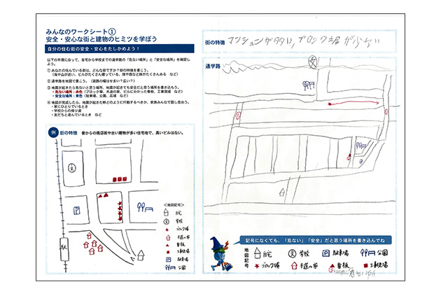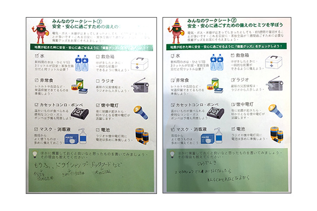 ツアーで学んだことを踏まえて、身近な場所の安全・安心について考えるワークシートに取り組みました。自宅から学校までの通学路を地図に描き、「危ない場所」と「安全な場所」を書き込んで自分の住む街の安全・安心を確かめたり、家族全員が1週間安全に過ごすための備蓄グッズがお家にそろっているかなどを確かめました。