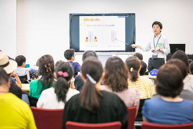 オリジナルの街に必要な建物や機能のアイデアを、保護者も一緒になって出し合いました。アイデアが出そろったら、いよいよ街づくりスタート。みんなの想いが詰まった街が完成したら、街にタイトルを付けて、街のテーマとポイントを班ごとに発表しました。みんなのアイデアを取り入れながら街づくりをすることで、実際に「アイデアを形にする」ことのおもしろさを体感しました。