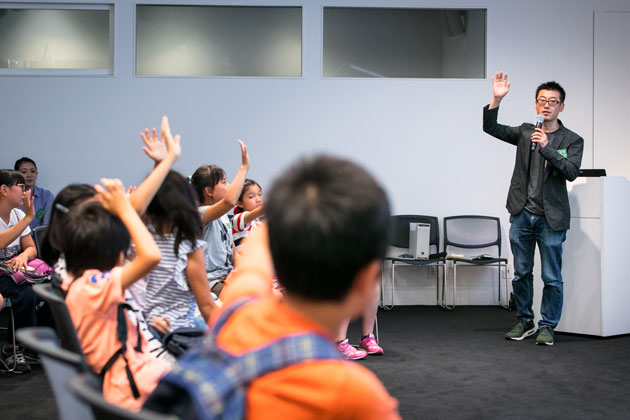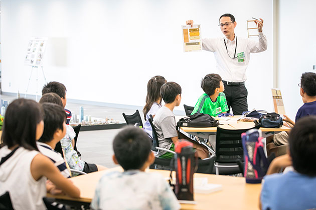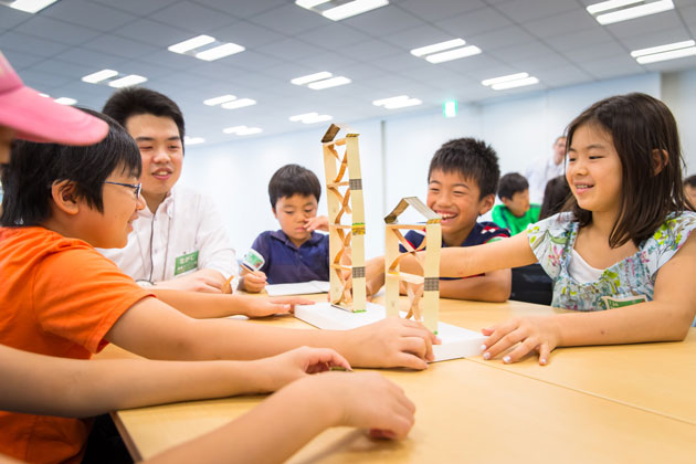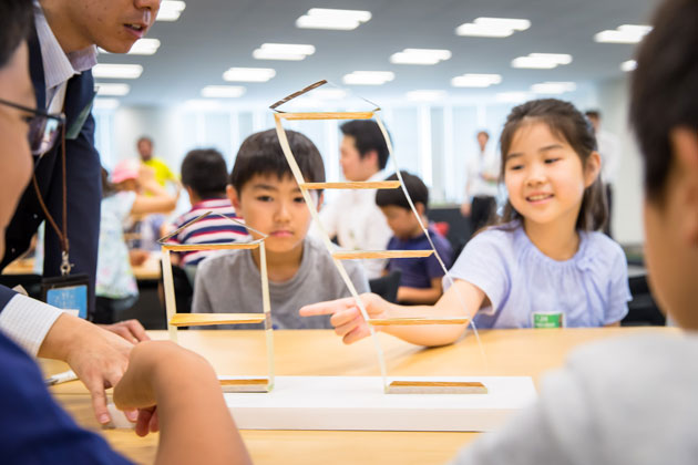 六本木ヒルズができるまでの話を例にして、森ビルが街づくりをするうえで大切にしている「安全」「環境」「文化」について学びました。その後、ワークショップの目玉となる工作キッド、「littleBits」や「Strawbees」の使い方を説明。初めて見る不思議な工作キッドにみんな興味津々でした!
