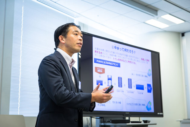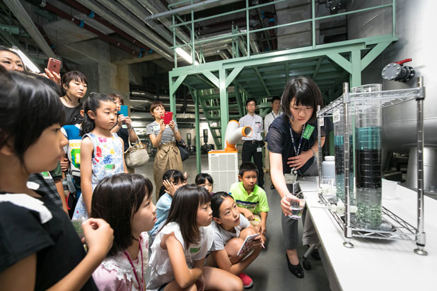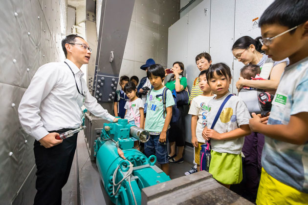 水を使った省エネの冷却装置「ドライミスト」や、六本木ヒルズ内のトイレ洗浄水として利用する中水を生成するための「ろ過施設」など、水を有効利用する仕組みを見学しました。
