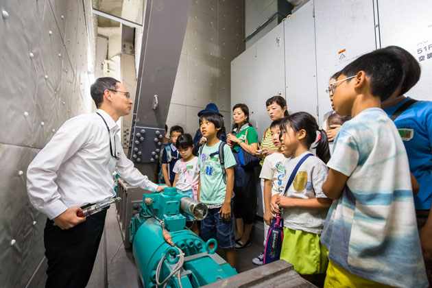 六本木ヒルズ森タワーには、地震の揺れをおさえるために必要な「制振装置」が全部で548個も設置されています。普段は入ることができない建物の裏側に設置されている制震装置を実際に見て、保護者の方も興味津々でした。