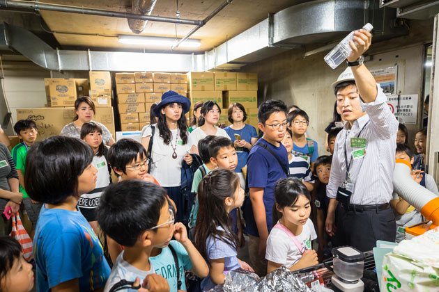 水資源の重要性や身近な節水方法を学ぶツアー。中水生成のためのろ過施設など、六本木ヒルズの水を有効利用するための設備を見学し、水資源の大切さについて考えました。ワークショップでは、中水プラントで見学した器具をペットボトルで再現し、水のろ過を体験しました。