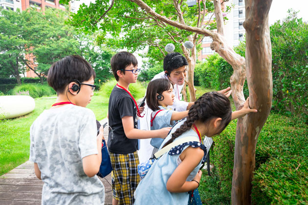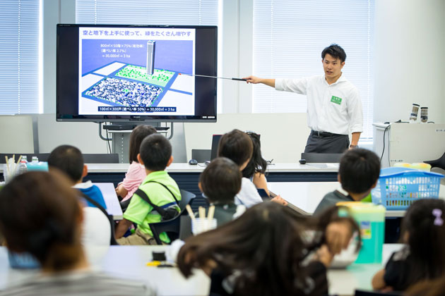 1年を通してさまざまな植物が私たちの目を楽しませてくれる、けやき坂コンプレックスの「屋上庭園」。田植えを終えた青々とした水田や、夏に花を咲かせるサルスベリを観察しながら、街づくりにおけるみどりの大切さを学びました。