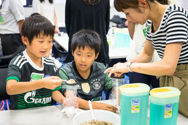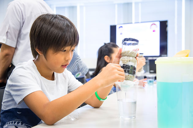 六本木ヒルズの水をきれいにする「ろ過施設」を見学した後は、ペットボトルや砂・小石などを利用してつくったキットで水のろ過実験を行いました。ワークショップは、子どもたちに大好評でした。