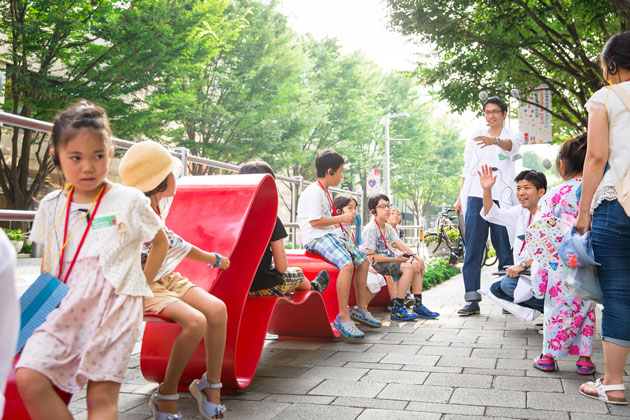 子どもだけでなく、大人もヒルズの裏側を探検したい!という声に応え、六本木ヒルズのヒミツをダイジェストで紹介するツアー。10万食分の非常食が保管されている「備蓄倉庫」や、四季折々の自然が感じられる「屋上庭園」などを見学。「探検家」や「魔法使い」になりきってヒルズの裏側を探検しました。
