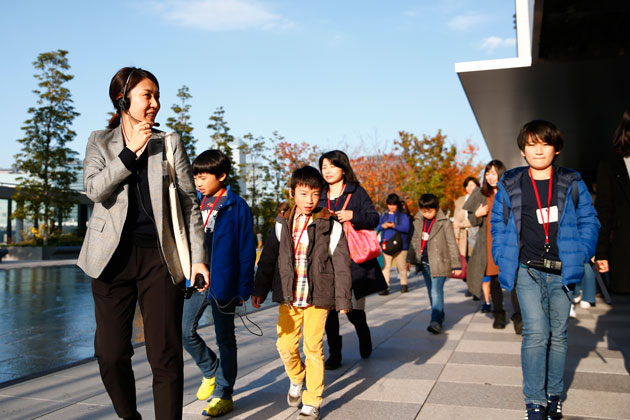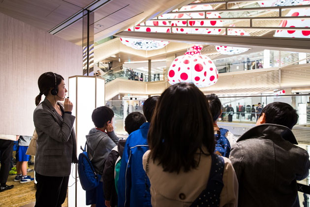 期間限定で展示中の草間弥生さんの作品をはじめ、施設内にちりばめられたアート作品を見学。都市におけるアートの役割を説明するとともに、作品に込められたメッセージやコンセプトなども紹介。アートの新しい楽しみ方を体験しました。
