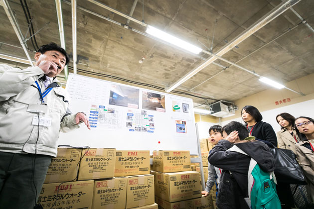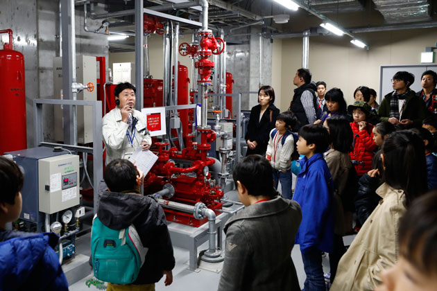 約3万食分の水と非常食がある備蓄倉庫や、飲食店などで使った水をトイレの洗浄水として再利用するための中水処理施設、非常用発電設備のある機械室を見学。「安全・安心」な街づくりの重要性について学びました。
