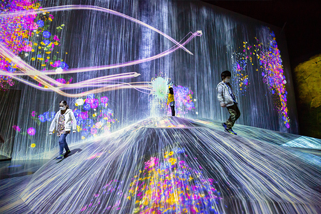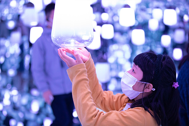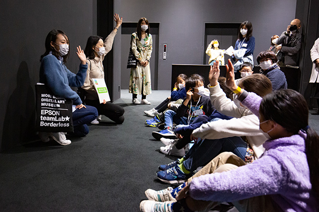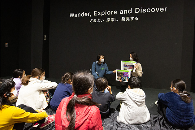 貸し切りのデジタルアートミュージアムで、作品の解説を聞きながら探検しました。人の動きに反応して動くアート作品など、最新のデジタルテクノロジーを使ったアート作品に、子どもたちだけでなくお父さんお母さんも興味津々。からだをいっぱい動かしながら、世界を惹きつけるヒミツを親子で探しました。