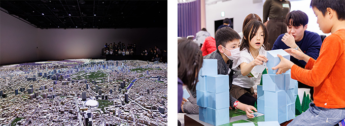街づくりで大切なポイントを学んだ後、特別公開の1/1000スケールの巨大都市模型を鳥の目線で見て、さらに模型に映し出されるプロジェクションマッピングで「東京」の街について学びます。