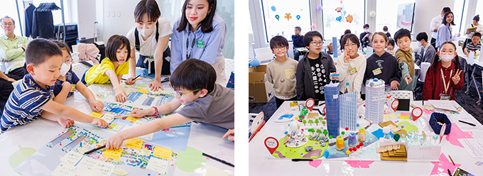 「みらまちキャンプ」は、子どもたちが「街づくり」や、街を考えるうえで大切なテーマ「安全」「環境」「文化」について、ヒルズの中を探検しながら楽しく学び、「未来の街」をつくるアイデアを考え、カタチにする体験プログラムです。